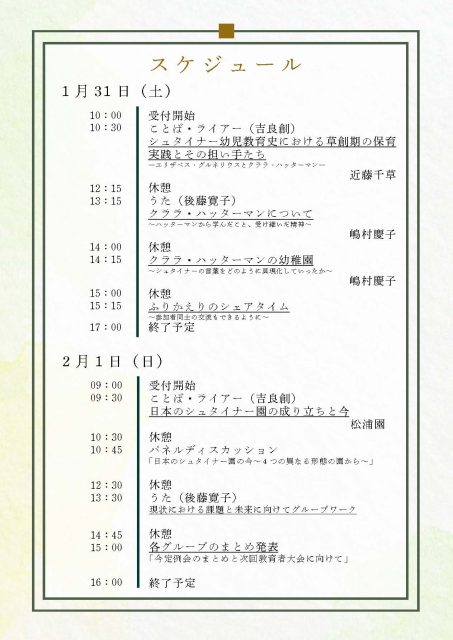 今回の研修会では、「シュタイナー幼児教育の始まりから未来へ」をテーマに据え、2 日間にわたるプログラムをご用意いたしました。